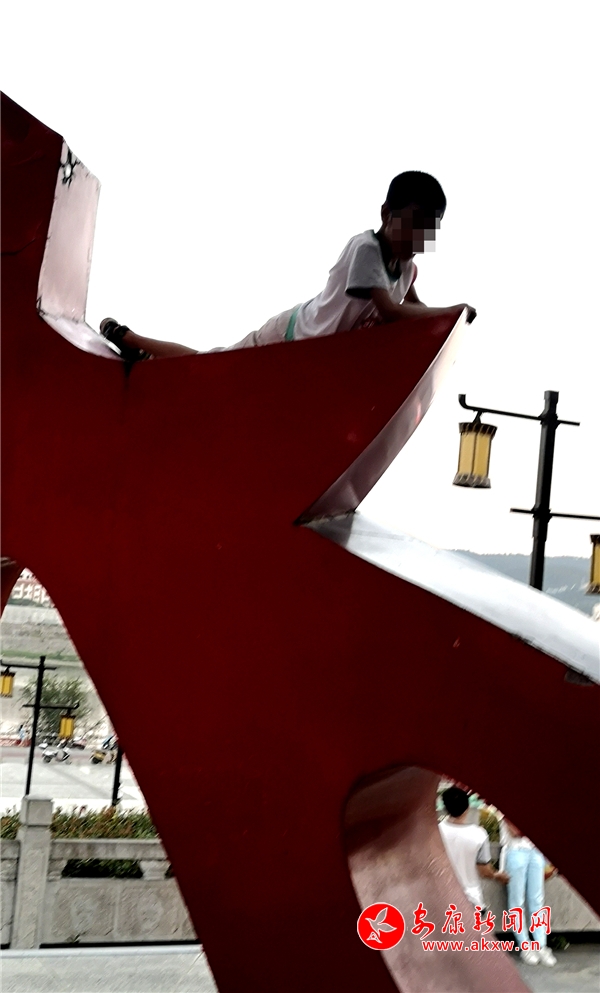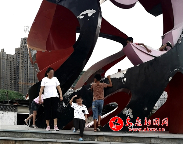 近日,記者在漢調(diào)二黃文化園看到,游玩的市民絡繹不絕,大部分市民都能做到文明游園,但其中也存在不文明行為。這里是文化園主題雕塑,幾個10歲左右的小男孩不斷攀爬雕塑,并在離地面約2米的高處逗留,現(xiàn)場既無工作人員勸導也沒有“禁止攀爬”的相關(guān)提示牌。記者 潘潤生 攝