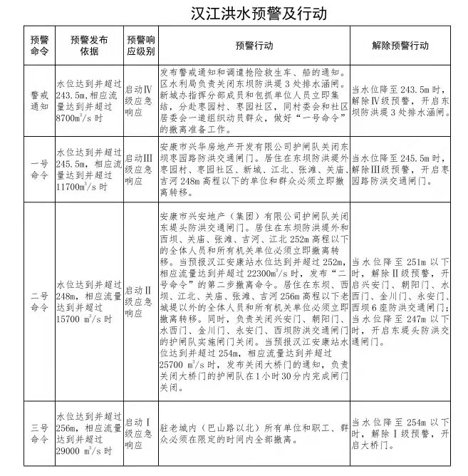 根據(jù)《安康市人民政府關(guān)于印發(fā)安康城區(qū)防汛抗洪預(yù)案的通知》有關(guān)漢江洪水預(yù)警及行動的內(nèi)容: