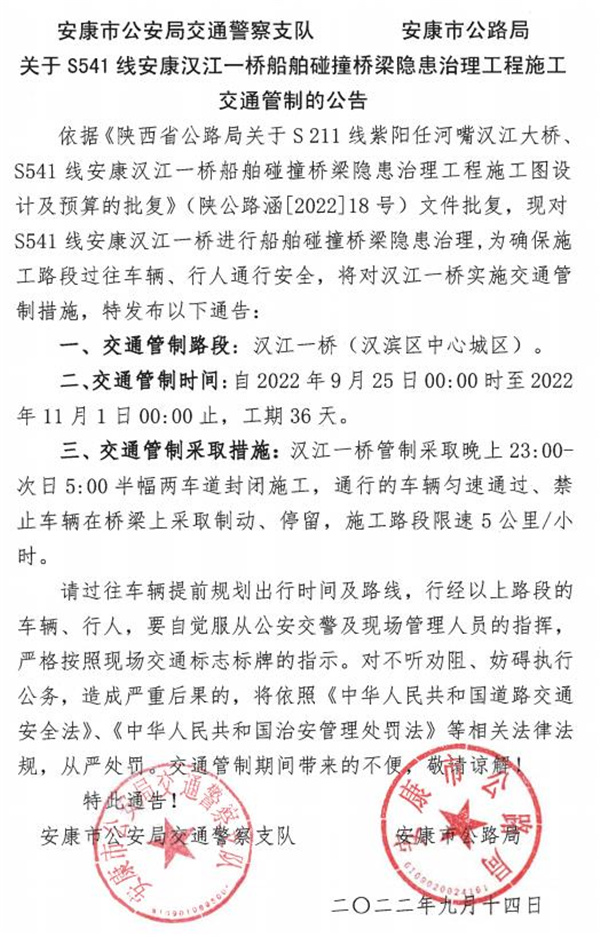 9月25日至11月1日安康漢江一橋?qū)⑦M(jìn)行船舶碰撞橋梁隱患治理工程施工,將對(duì)漢江一橋?qū)嵭?strong>交通管制36天,管制采取晚上23:00-次日5:00半幅兩車(chē)道封閉施工,通行的車(chē)輛勻速通過(guò),禁止車(chē)輛在橋梁上采取制動(dòng)、停留,施工路段限速5公里/小時(shí)。