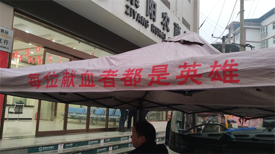 獻血車下的體檢棚子上寫著這樣一句話:每位獻血者都是英雄。