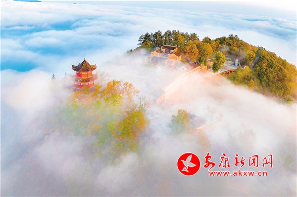 天柱山最美不過秋色,也是我在四季當(dāng)中頻繁上山的季節(jié)。每逢秋天,這里紅黃綠相間,漫山掛彩,在藍(lán)天的映襯下,多了幾分浪漫。從國道211起點(diǎn)的兩條上山公路,由數(shù)個(gè)“之”字連接起來,從湖邊一直盤旋至山頂?shù)陌自乒潘?,遠(yuǎn)眺仿佛一個(gè)大大的“人”字形飄帶。雨后放晴的頭兩個(gè)早晨,在云霧的籠罩下,天柱山的下半身連同湖面一并被巨大的“蠶絲被”覆蓋,山的上半身或山頭浮在云海之上,像是茫茫大海上的一座孤島。