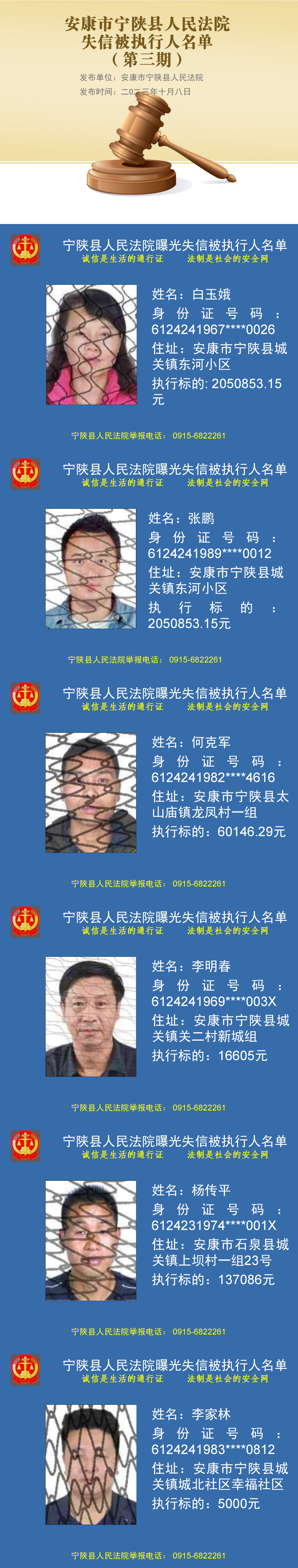 為維護(hù)司法權(quán)威,推動(dòng)社會(huì)誠信體系建設(shè),促使被執(zhí)行人履行生效法律文書確定的義務(wù),根據(jù)《中華人民共和國民事訴訟法》第二百五十五條和《最高人民法院關(guān)于公布失信被執(zhí)行人名單信息的若干規(guī)定》的規(guī)定,被執(zhí)行人具有履行能力而不履行生效法律文書確定的義務(wù),人民法院應(yīng)當(dāng)將其納入失信被執(zhí)行人名單,依法對(duì)其進(jìn)行信用懲戒。現(xiàn)將安康市寧陜縣人民法院2023年第三期失信被執(zhí)行人名單予以公布。