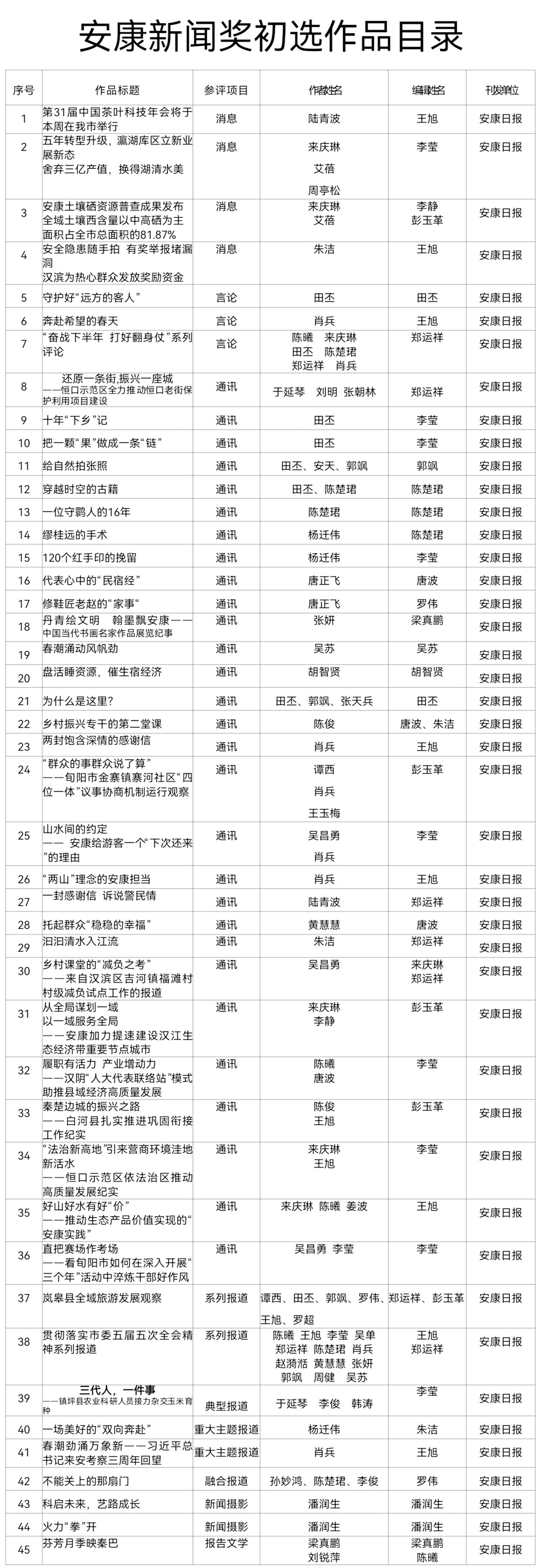 經(jīng)過3月20日編委會(huì)推薦、社黨委研究決定,擬推薦以下45件新聞作品參評(píng)2023年度“安康新聞獎(jiǎng)”。公示時(shí)間從2024年3月21日至2024年3月27日,公示期5個(gè)工作日。如有不同意見,請向安康日報(bào)社機(jī)關(guān)紀(jì)委、新聞管理部反映。