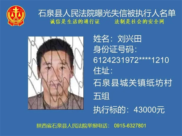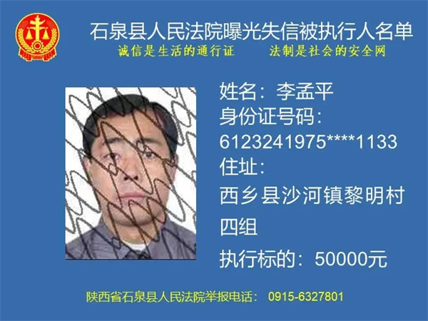 為了進(jìn)一步加大執(zhí)行力度,保障勝訴當(dāng)事人的合法權(quán)益,推進(jìn)社會(huì)誠(chéng)信體系建設(shè),依照《中華人民共和國(guó)民事訴訟法》《最高人民法院關(guān)于公布失信被執(zhí)行人名單信息的若干規(guī)定》等法律、司法解釋的有關(guān)規(guī)定,現(xiàn)對(duì)一批已進(jìn)入執(zhí)行程序,且尚未全部履行義務(wù)的被執(zhí)行人進(jìn)行媒體曝光,歡迎廣大群眾支持石泉縣人民法院的工作,向我院提供被執(zhí)行人的財(cái)產(chǎn)線索,使生效法律文書(shū)能夠得到切實(shí)執(zhí)行,讓人民群眾切實(shí)感受到公平正義就在身邊。