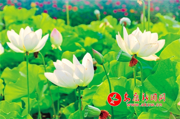 時至今日,倘單從觀賞的角度講,漢陰縣雙乳鎮(zhèn)的千畝荷塘所營造的美景,亦是難得一見的。置身荷塘邊,千澄一碧。人仿佛闖進(jìn)荷的世界,頓生突兀、渺小之感,“接天蓮葉無窮碧,映日荷花別樣紅”中的無窮,就是此番氣象。那些翠綠的荷葉似圓盤一般,密密匝匝,不透一絲縫隙。而除了滿目的綠葉,高高低低間,荷花娉婷裊裊地立在荷塘,沖擊著人的視覺。那些吸引人眼球的粉白花朵,在藍(lán)天白云、青山綠水的映襯下,格外讓人憐愛。