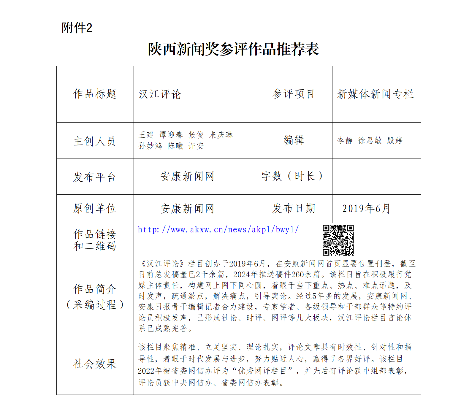 經(jīng)過社黨委研究決定,擬推薦以下2件新聞作品參評“2024年度陜西新聞獎融合報道、應(yīng)用創(chuàng)新和新媒體新聞專欄”。公示時間從2025年1月6日至2025年1月10日,公示期5個工作日。如有不同意見,請向安康日報社機關(guān)紀委、新聞管理部反映。