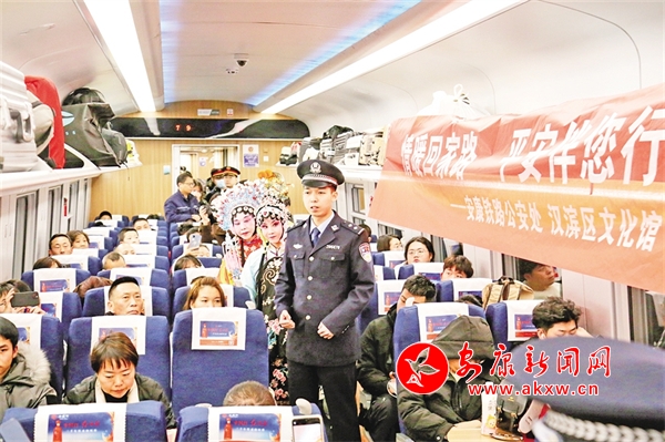 火車穿越秦巴山水間,途中,來自安康漢調(diào)二黃研究院的專業(yè)演員和地方民間漢調(diào)二黃愛好者們一同表演了國家級非物質(zhì)文化遺產(chǎn)——漢調(diào)二黃經(jīng)典戲曲演唱,并為旅客們講解漢調(diào)二黃戲曲知識,與旅客們開展互動交流,讓旅客親身體驗(yàn)漢調(diào)二黃戲服道具,感受漢調(diào)二黃的獨(dú)特藝術(shù)魅力。來自漢濱區(qū)文化館的漢濱剪紙技藝傳承人為旅客們展示講解了安康市級非物質(zhì)文化遺產(chǎn)——漢濱剪紙技藝,向參與互動的旅客送上了親手創(chuàng)作的漢濱剪紙作品,提前送上新春祝福?;顒又?,西安鐵路公安局安康公安處的民警們和文藝工作者們一同宣傳普及了反詐知識,進(jìn)一步提升旅客的安全防范意識。