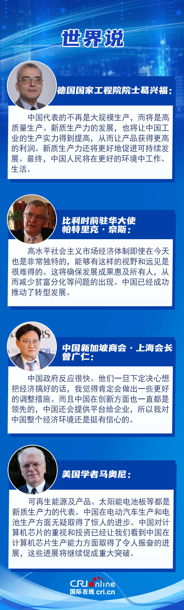 多位國際人士對中國經濟發(fā)展充滿信心,高度肯定中國政府在經濟發(fā)展中的核心引領作用,并對中國在高質量生產及高精尖領域的創(chuàng)新領先地位表示贊賞。