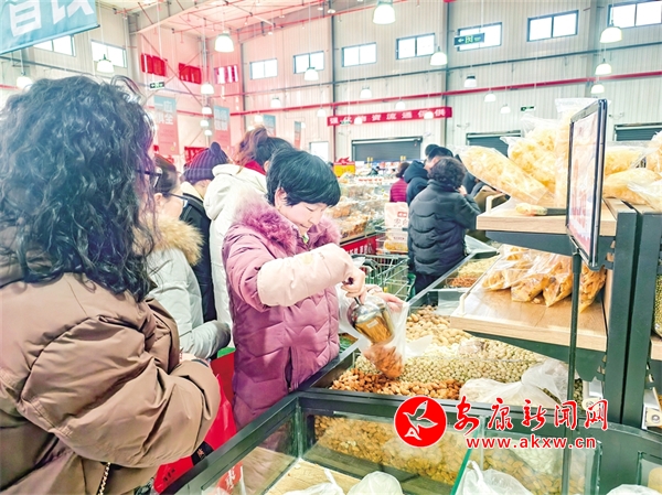 “這里的年貨品類齊全、物美價廉,我選了一些干果和調(diào)味料,聽說這里的豬肉都是農(nóng)家喂養(yǎng)的,看起來很新鮮,一會兒還要買一些回去嘗一嘗?!壁s集的劉女士一邊開心地展示著自己選購的商品,一邊和導(dǎo)購交流。