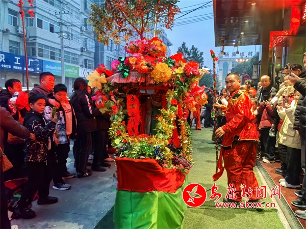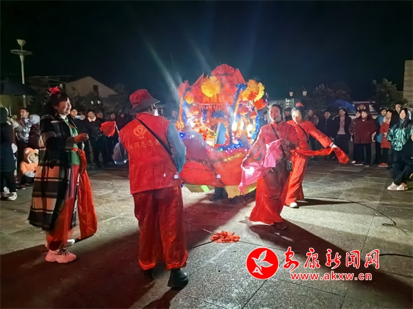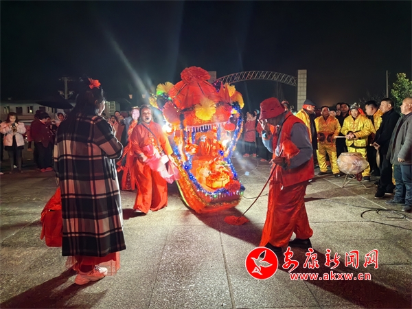 在位于漢陰縣平梁鎮(zhèn)的興隆佳苑社區(qū),春節(jié)期間,小區(qū)里處處洋溢著節(jié)日氛圍。夜幕降臨,社區(qū)廣場(chǎng)響起陣陣鑼鼓聲,?;ù硌菡介_始。只見表演者雙手提船、配合默契,船體隨著“波浪”旋轉(zhuǎn)、顛簸,身穿喜慶艷麗的服裝、頭戴五彩頭飾的表演人員個(gè)個(gè)精神抖擻,一邊前行,一邊唱著漢陰本地的花鼓戲,祈求來(lái)年風(fēng)調(diào)雨順、福壽安康。翻飛的彩扇、華麗的彩船,精心編排、詼諧幽默的表演,為社區(qū)群眾呈現(xiàn)了一場(chǎng)精彩的視覺盛宴。