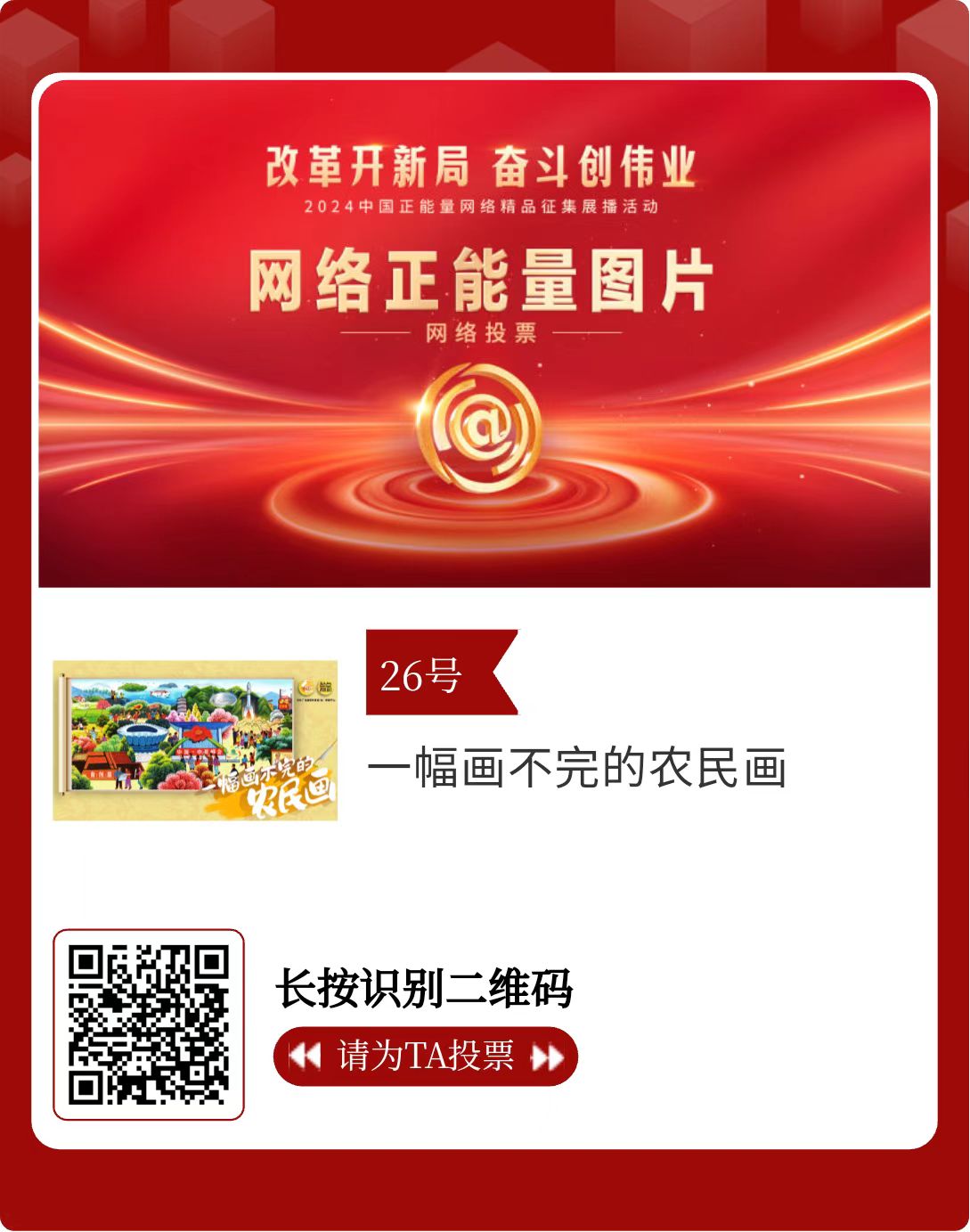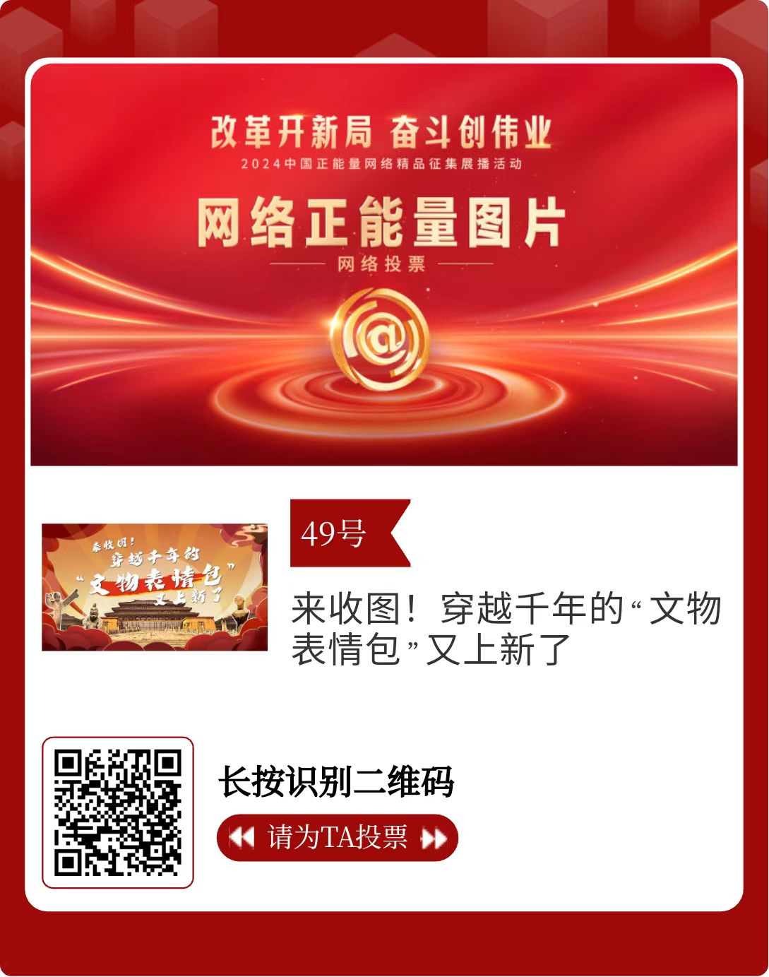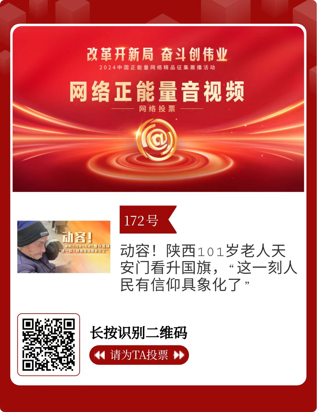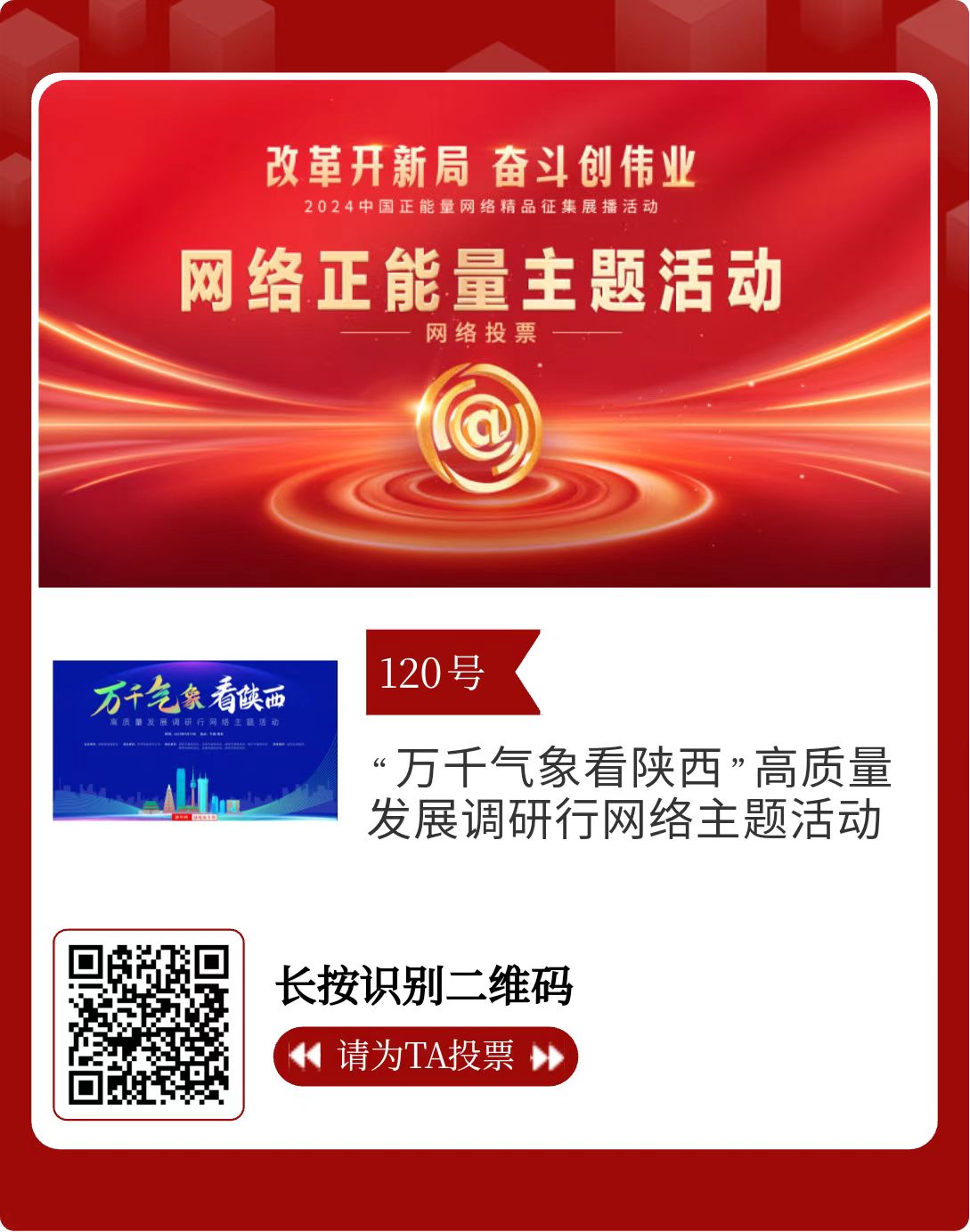 改革開新局,奮斗創(chuàng)偉業(yè)。由中央網(wǎng)信辦主辦的2024中國(guó)正能量網(wǎng)絡(luò)精品征集展播活動(dòng)今天啟動(dòng)網(wǎng)絡(luò)展播投票。