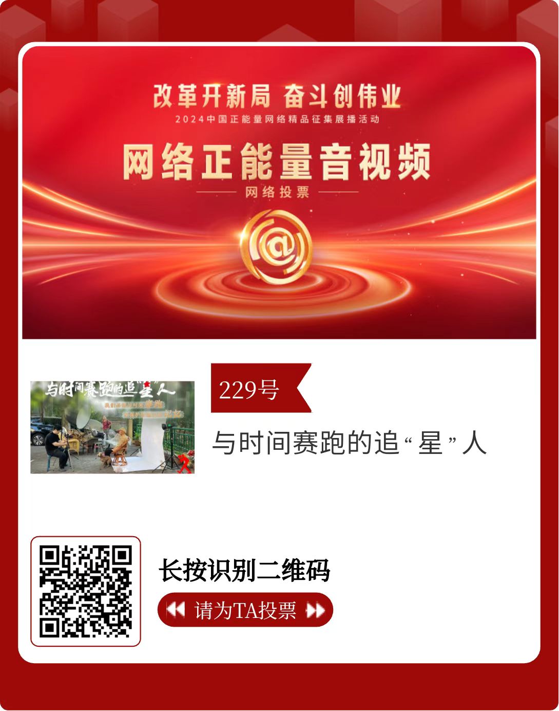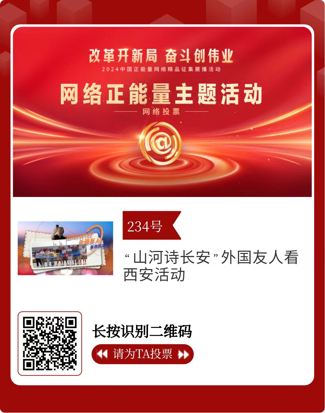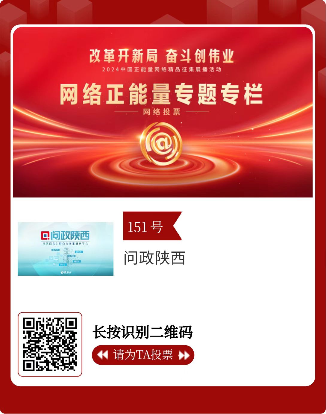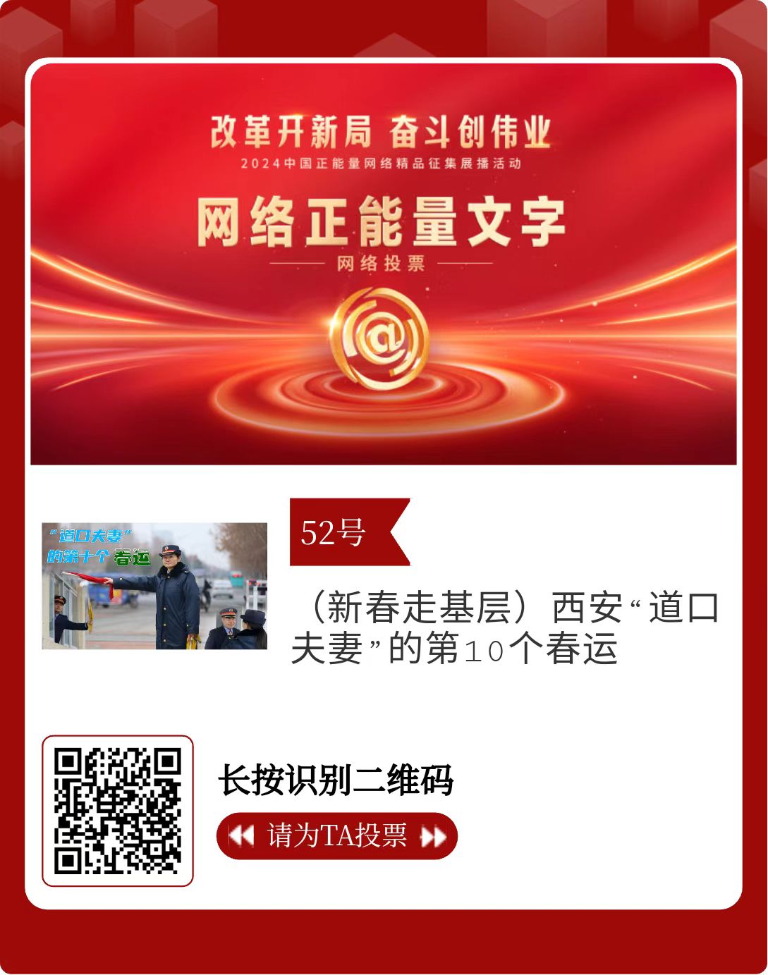 改革開新局,奮斗創(chuàng)偉業(yè)。由中央網(wǎng)信辦主辦的2024中國(guó)正能量網(wǎng)絡(luò)精品征集展播活動(dòng)今天啟動(dòng)網(wǎng)絡(luò)展播投票。
