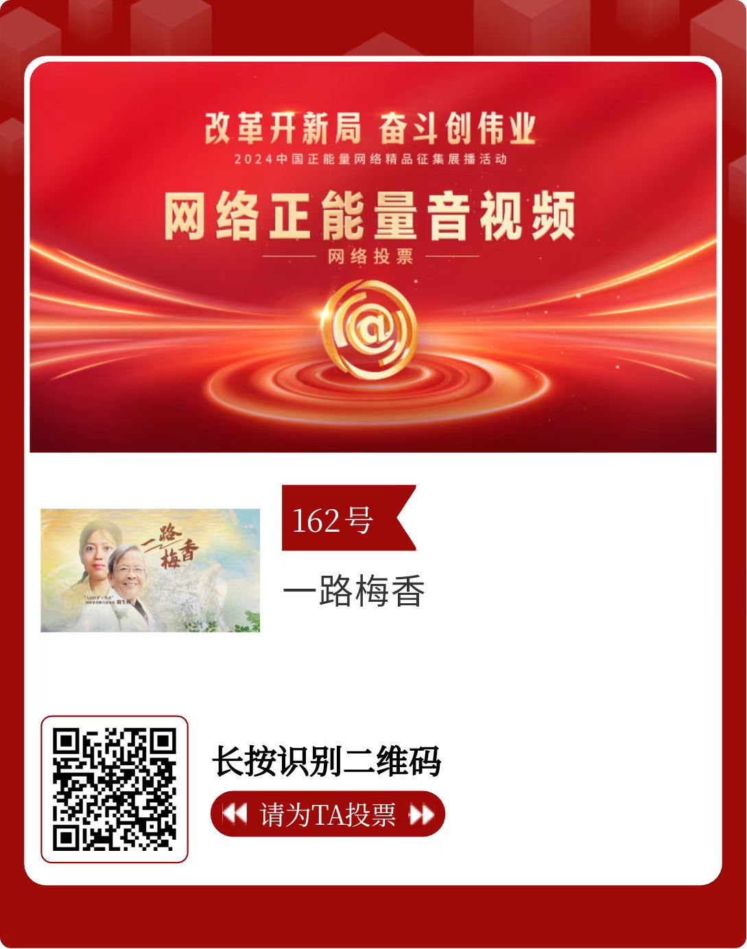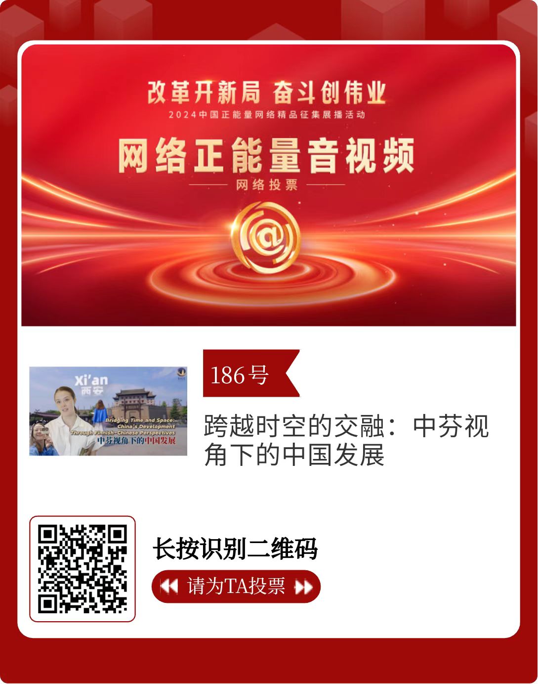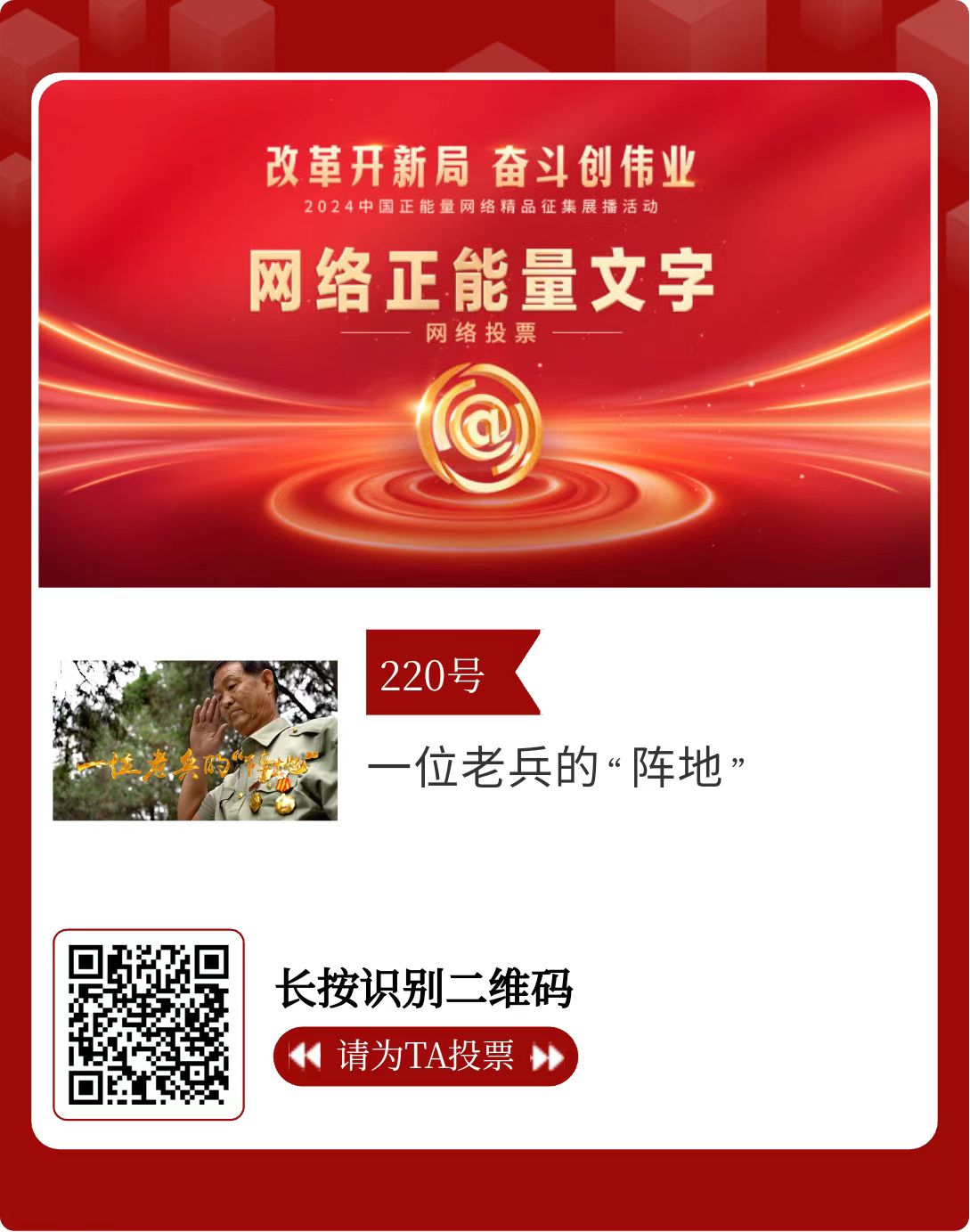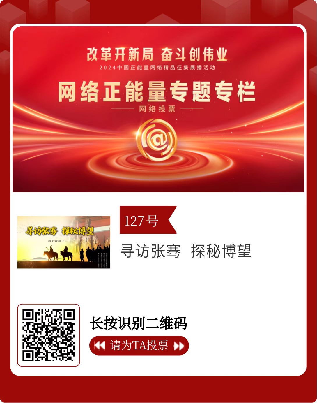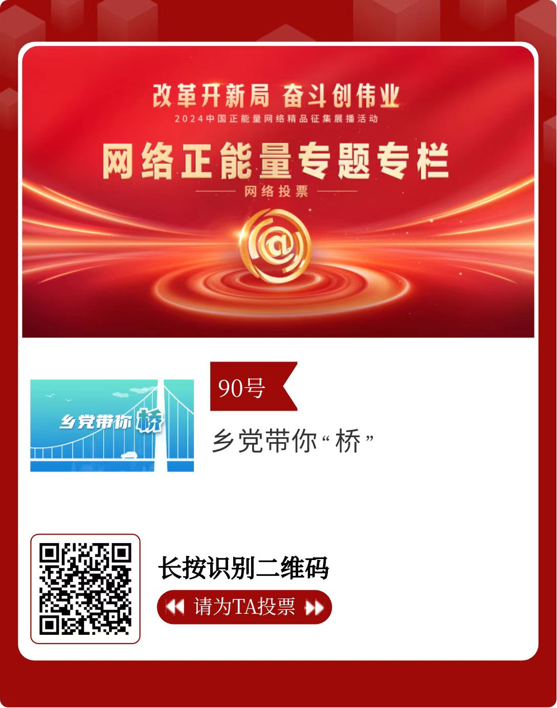 改革開新局,奮斗創(chuàng)偉業(yè)。由中央網(wǎng)信辦主辦的2024中國(guó)正能量網(wǎng)絡(luò)精品征集展播活動(dòng)今天啟動(dòng)網(wǎng)絡(luò)展播投票。