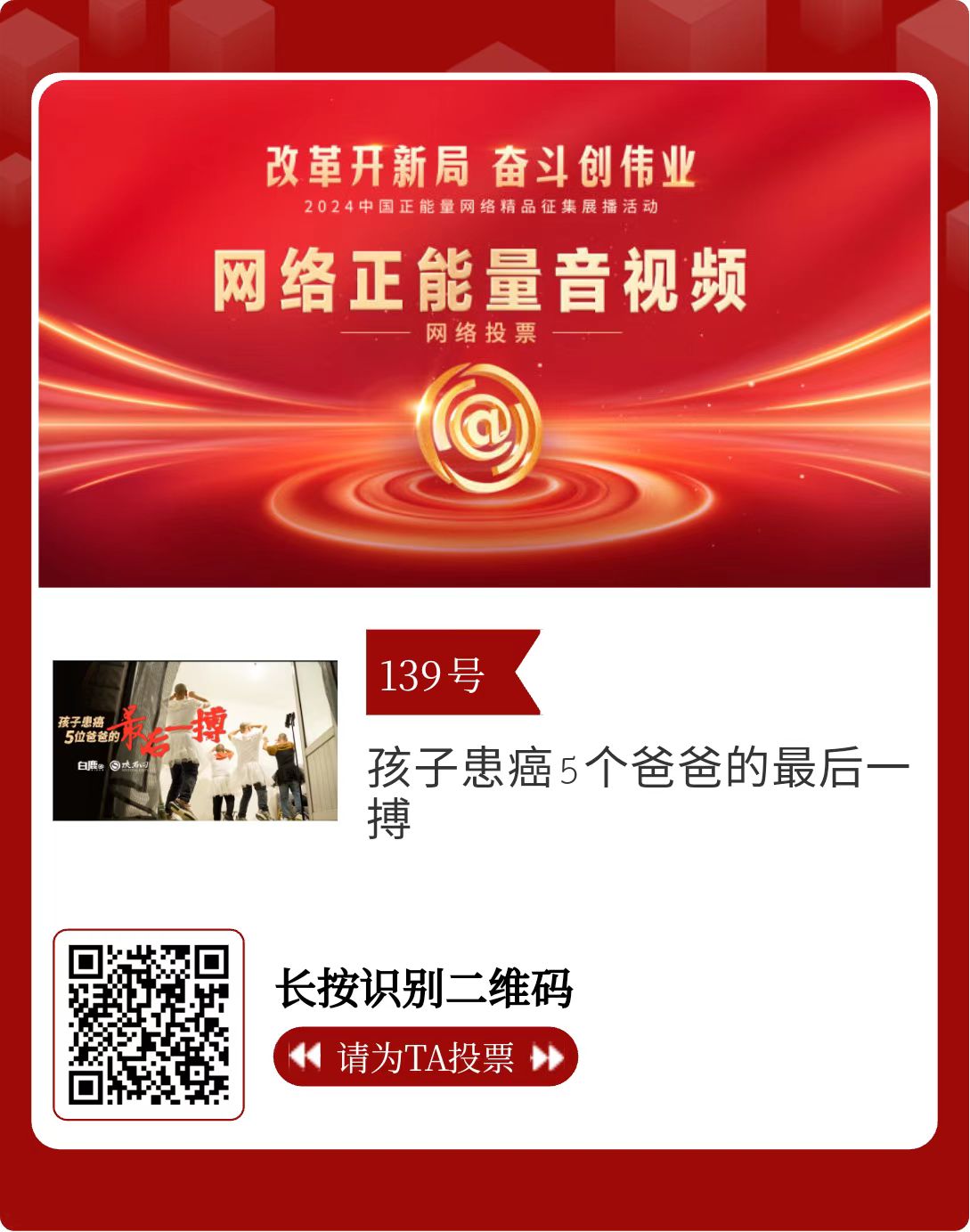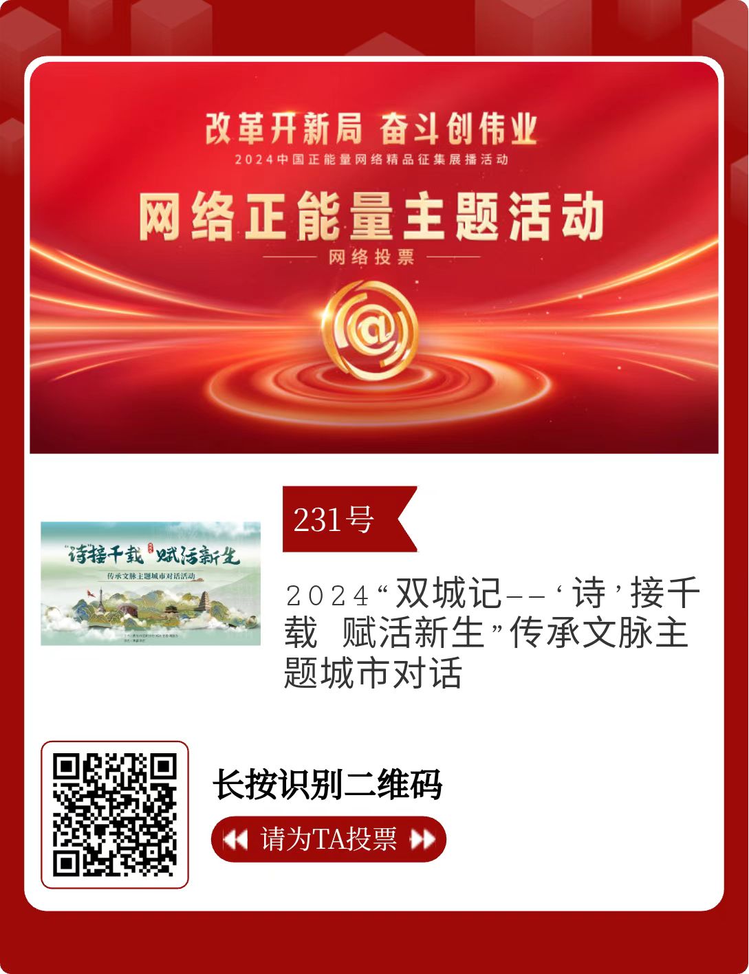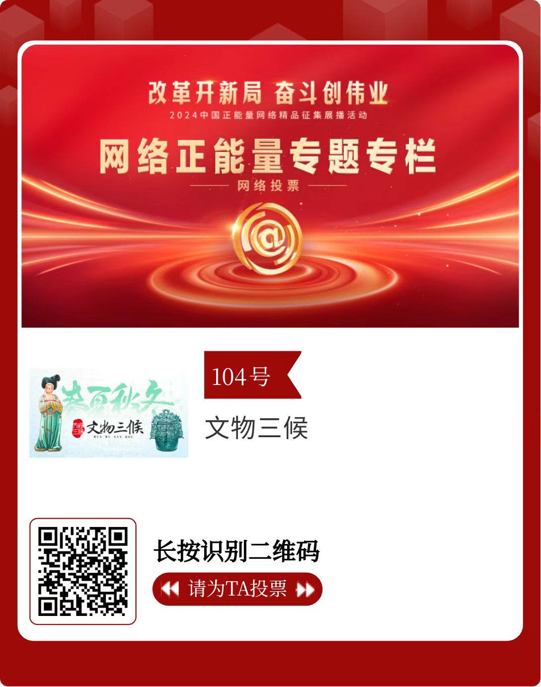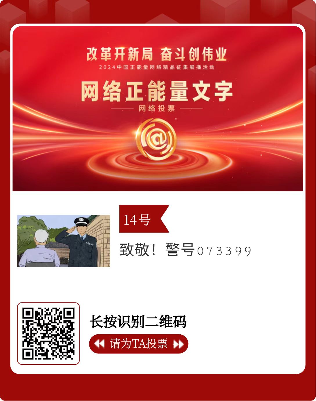 改革開新局,奮斗創(chuàng)偉業(yè)。由中央網(wǎng)信辦主辦的2024中國(guó)正能量網(wǎng)絡(luò)精品征集展播活動(dòng)今天啟動(dòng)網(wǎng)絡(luò)展播投票。