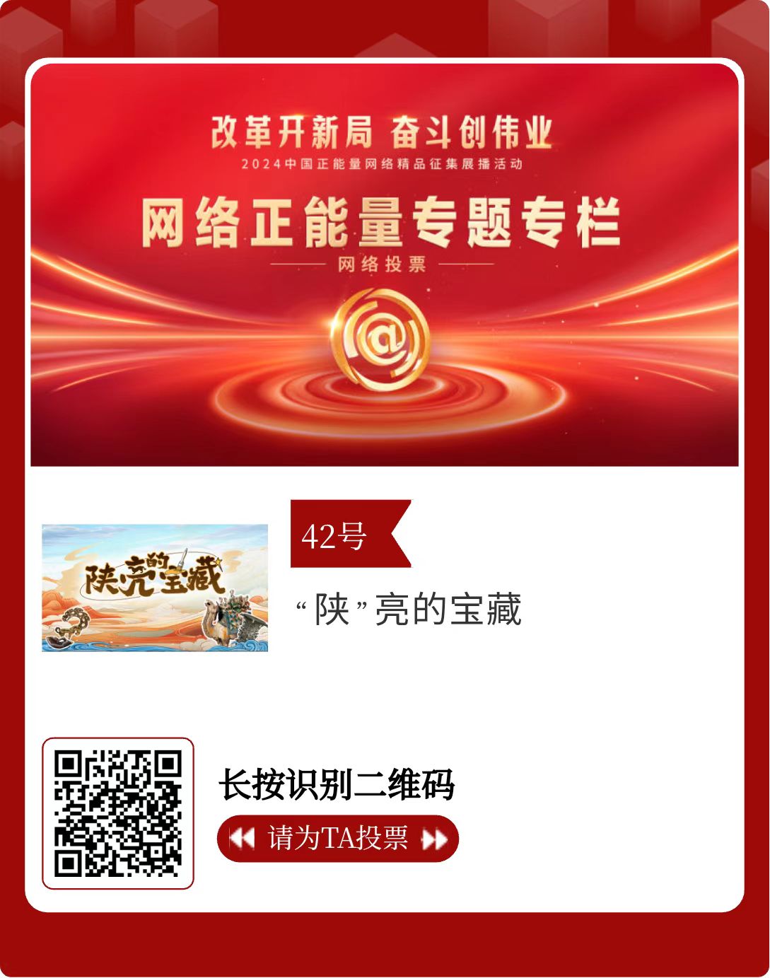 陜西省32件作品進(jìn)入投票環(huán)節(jié),投票時(shí)間為2月15日至2月21日,投票結(jié)果將作為中國(guó)正能量網(wǎng)絡(luò)精品遴選的重要參考。中國(guó)正能量網(wǎng)絡(luò)精品,期待每一個(gè)充滿正能量的你投出點(diǎn)贊一票。