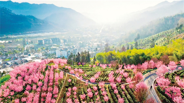 沿著茶山步道拾級而上,茶農(nóng)采青的竹簍與游人拍照的紗巾在梯田間次第閃現(xiàn)。粉白相間的梅花如云絮般綴滿枝頭,風(fēng)過處,花瓣簌簌落入茶叢,為嫩綠的新芽染上淡淡馨香。遠處黛瓦白墻的徽派民居與近處起伏的茶壟構(gòu)成天然畫框,無人機視角下,蜿蜒的茶道如同玉帶纏繞山腰,將紅楓、櫻花、梅林串成斑斕的珠鏈。