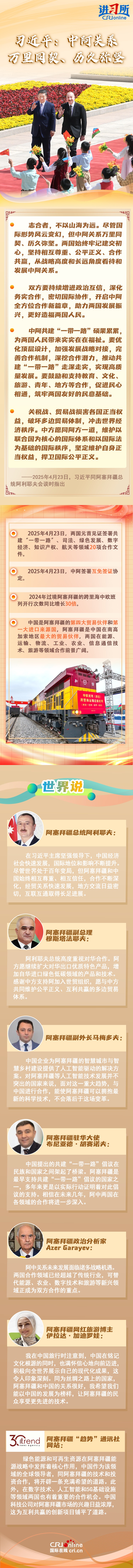 4月23日,中國國家主席習(xí)近平在北京同阿塞拜疆總統(tǒng)阿利耶夫舉行會談。兩國元首宣布,建立中阿全面戰(zhàn)略伙伴關(guān)系。習(xí)近平指出,盡管國際形勢風(fēng)云變幻,但中阿關(guān)系萬里同契、歷久彌堅。雙方要持續(xù)增進(jìn)政治互信,深化務(wù)實合作,密切國際協(xié)作,開啟中阿全方位合作新篇章,助力兩國發(fā)展振興,更好造福兩國人民。