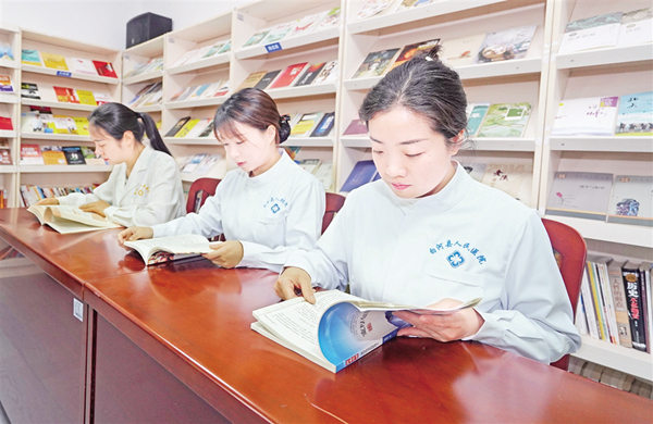 4月23日,白河縣人民醫(yī)院護士利用工作間隙在圖書角專注閱讀。(伍渭康 攝)??