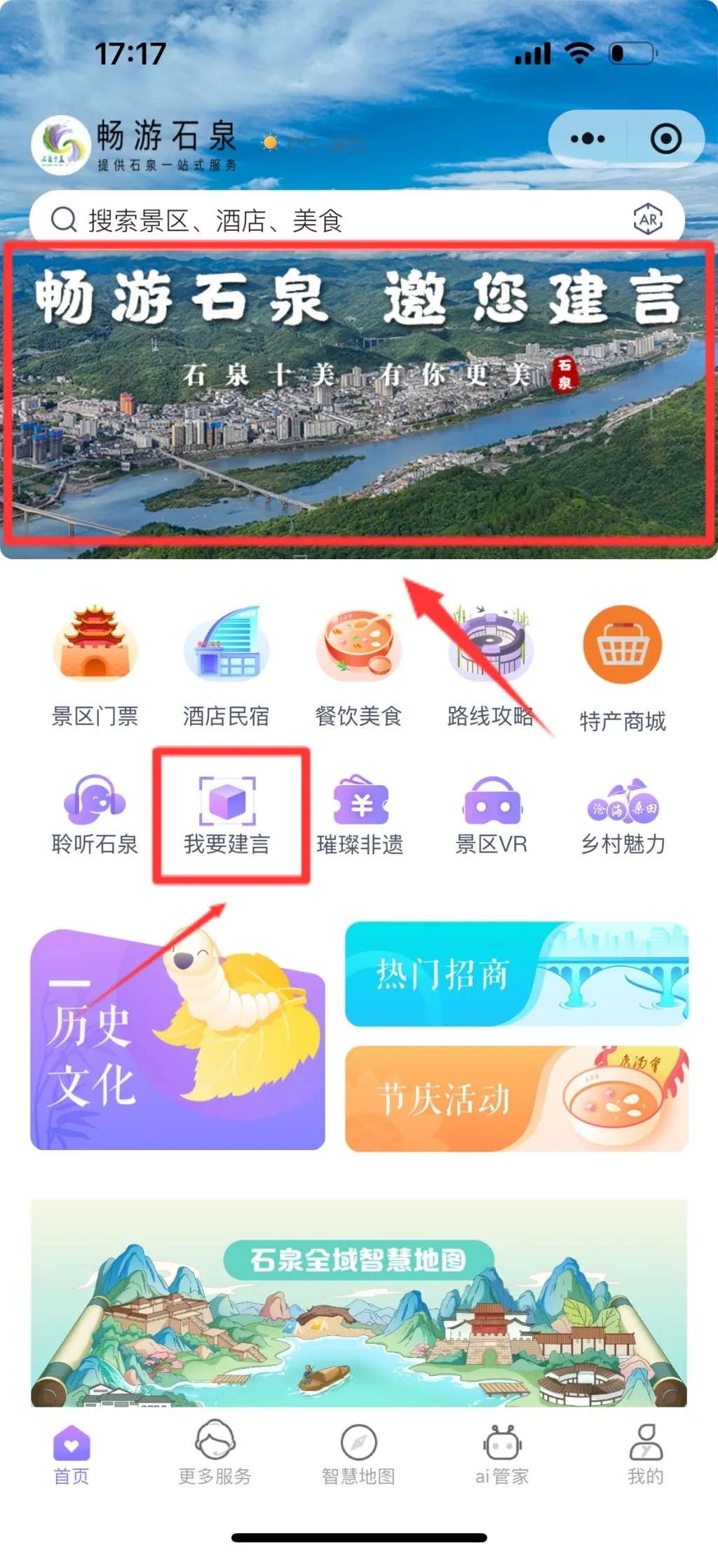 1.官方賬號(hào):打開“暢游石泉”小程序,點(diǎn)擊“暢游石泉 邀您建言”意見建議征集頁面,提交建議。