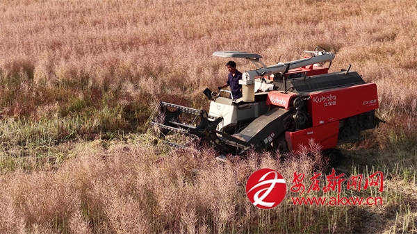 “我們有一臺直收的收割機(jī),還有兩臺分段收割的收割機(jī),比人工快多了,一畝田有個(gè)十幾分鐘就收完了。”一臺新型現(xiàn)代化收割機(jī)在田間來回穿梭,田里的秸稈茬口整齊如梳,剛卸下的菜籽在陽光下泛著油光。據(jù)了解,該合作社400畝示范基地全部采用機(jī)械化收割,起到了良好的示范推廣作用。