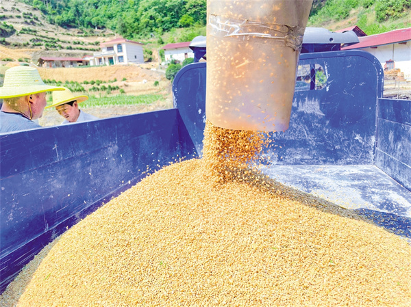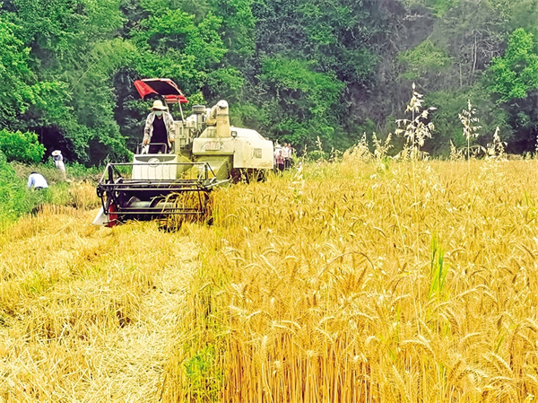 風(fēng)吹麥田千層浪,又到一年收獲時。在漢濱區(qū)晏壩鎮(zhèn)中心社區(qū)安康客意然農(nóng)業(yè)開發(fā)有限公司種植園區(qū)內(nèi),小麥在陽光的照耀下,閃著金燦燦的光芒,沉甸甸的麥穗隨風(fēng)搖曳,發(fā)出“沙沙”聲響。收割機(jī)正馬力全開,在金色麥浪中來回穿梭,伴隨著陣陣轟鳴聲,小麥從機(jī)艙中傾瀉而出,顆顆金黃、粒粒飽滿,裝滿車輛,整個過程一氣呵成,高效而精準(zhǔn)。