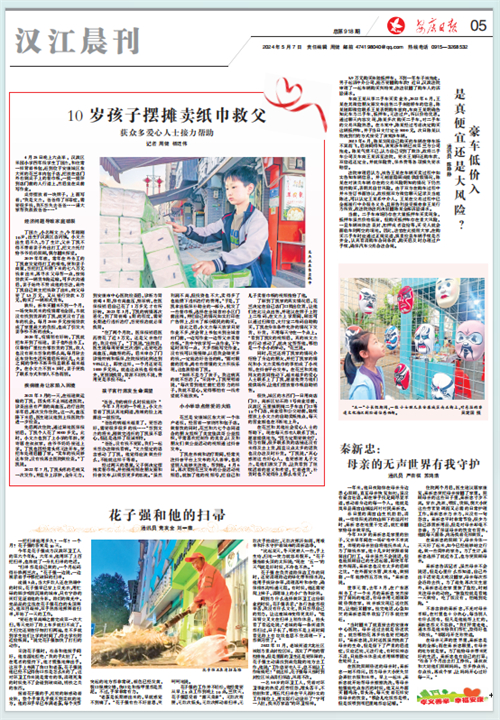 (2024年5月7日安康日報05版“10歲孩子擺攤賣紙巾救父 獲眾多愛心人士接力幫助”)