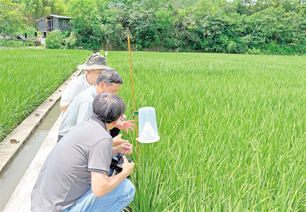 日頭漸漸升高,稻田里的露水被曬成水汽,連片的稻禾舒展著葉片,陽(yáng)光下泛著健康的碧綠色。黃林權(quán)沿著田壟往前走,每經(jīng)過(guò)一個(gè)誘捕器就停下來(lái),或調(diào)整角度,或記錄數(shù)量,鞋上的泥點(diǎn)濺到褲腿上也渾然不覺(jué)。