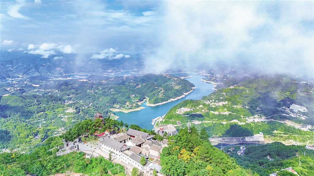 8月14日清晨,站在瀛湖風景區(qū)內遠眺,遠山、村莊相互映襯,風景如畫。趙華斌 攝