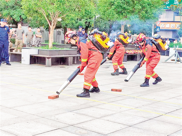 完成后,隊(duì)員迅速背負(fù)風(fēng)力滅火機(jī),將起點(diǎn)處的紅磚吹過10米終點(diǎn)處。風(fēng)力滅火機(jī)呼嘯作響,隊(duì)員們需精準(zhǔn)控制風(fēng)力方向和強(qiáng)度,這模擬的是實(shí)戰(zhàn)中清理障礙物、開辟隔離帶的場(chǎng)景。