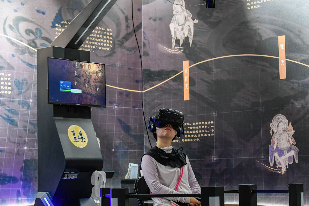 2024年7月22日,游客在“尋境敦煌——數(shù)字敦煌沉浸展”借助VR設(shè)備沉浸式游覽莫高窟第285窟虛擬場景?!皩ぞ扯鼗汀獢?shù)字敦煌沉浸展”綜合運(yùn)用VR虛擬現(xiàn)實(shí)、三維建模、游戲引擎的物理渲染和全局動態(tài)光照等新技術(shù),高精度立體還原了莫高窟第285窟。游客戴上VR眼鏡,不僅可以零距離觀賞壁畫、360度自由探索洞窟細(xì)節(jié),還能“飛升”到窟頂,身臨其境參與壁畫故事情節(jié),沉浸式感受敦煌文化的魅力。