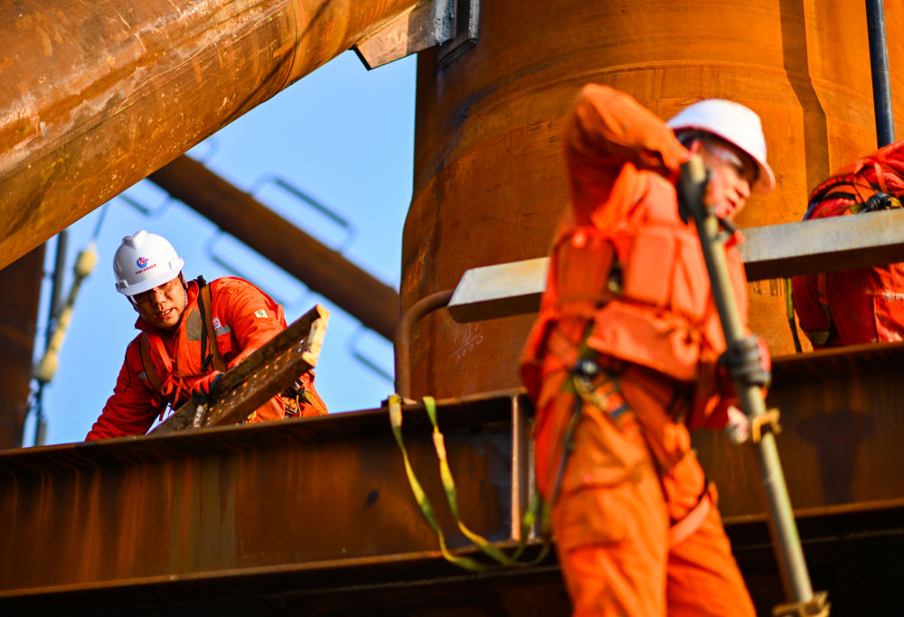??2026年2月13日,工人在位于渤海中部海域的渤中26-6油田開發(fā)項(xiàng)目(二期)作業(yè)現(xiàn)場(chǎng)施工。新華社記者 趙子碩 攝