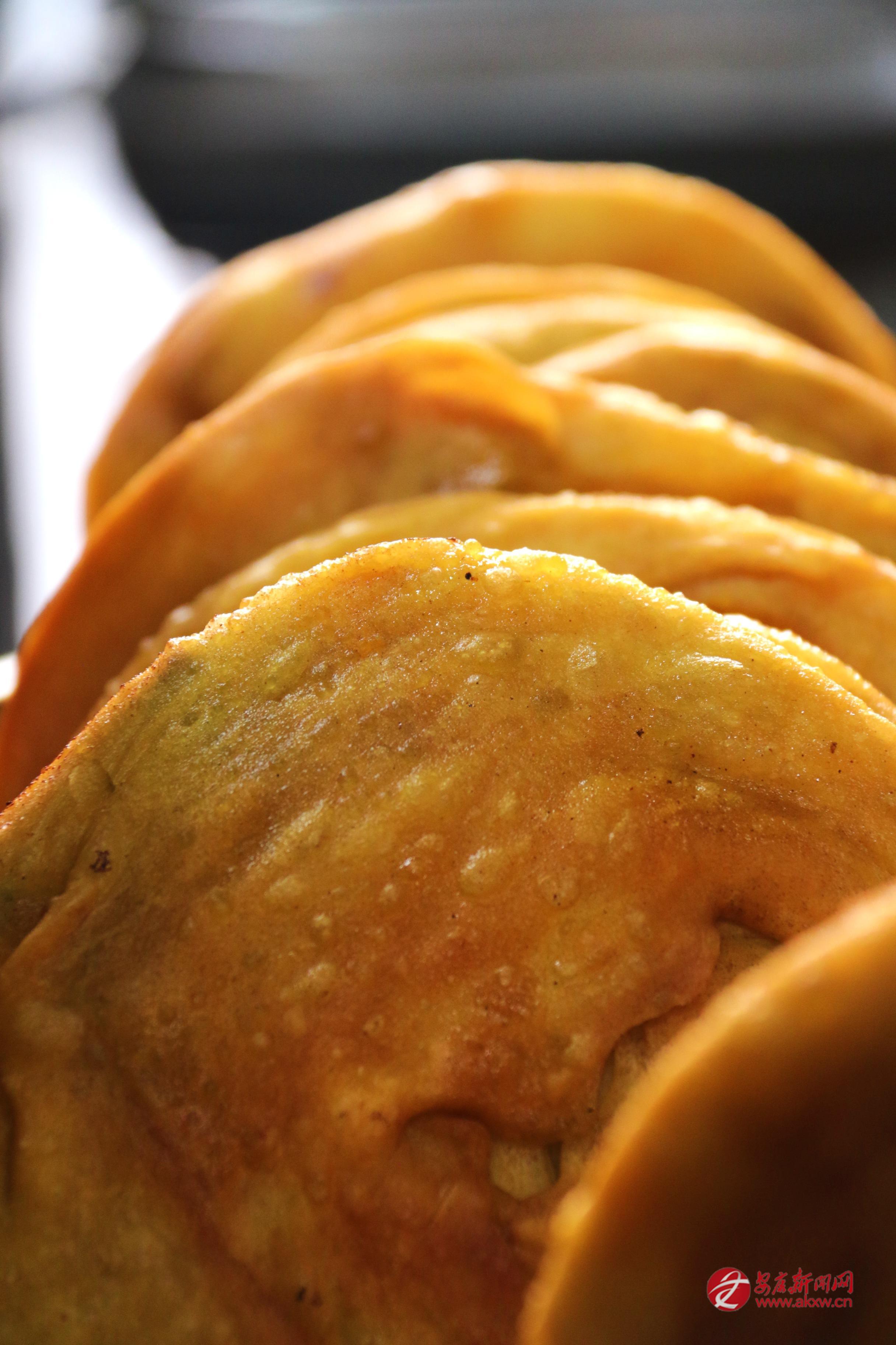 煎餅要用平底鍋,油要多,最好能沒過餅的一半。鍋燒熱了,放一點煉過的羊油,那油在鍋底滋滋地化開,香氣就起來了。餅放下去,小火慢煎,不住地翻面。眼看著,餅子慢慢鼓起來,皮兒漸漸金黃,有些地方焦黃了,有些地方還嫩著。起鍋的時候,整個餅子金黃黃的,油光光的,拿在手里燙得很。