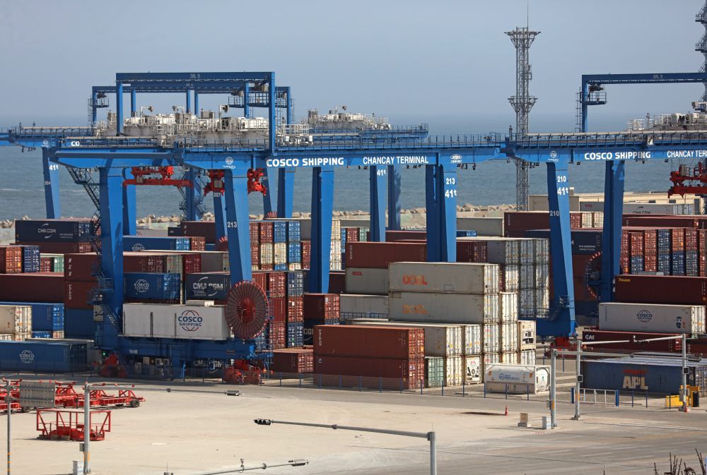 這是2025年10月7日拍攝的秘魯錢凱港碼頭擺放的集裝箱。位于秘魯首都利馬以北約80公里的錢凱港于2024年11月正式開港,標(biāo)志著中秘共建“一帶一路”取得新的重要成果。新華社發(fā)(瑪麗安娜·巴索 攝)