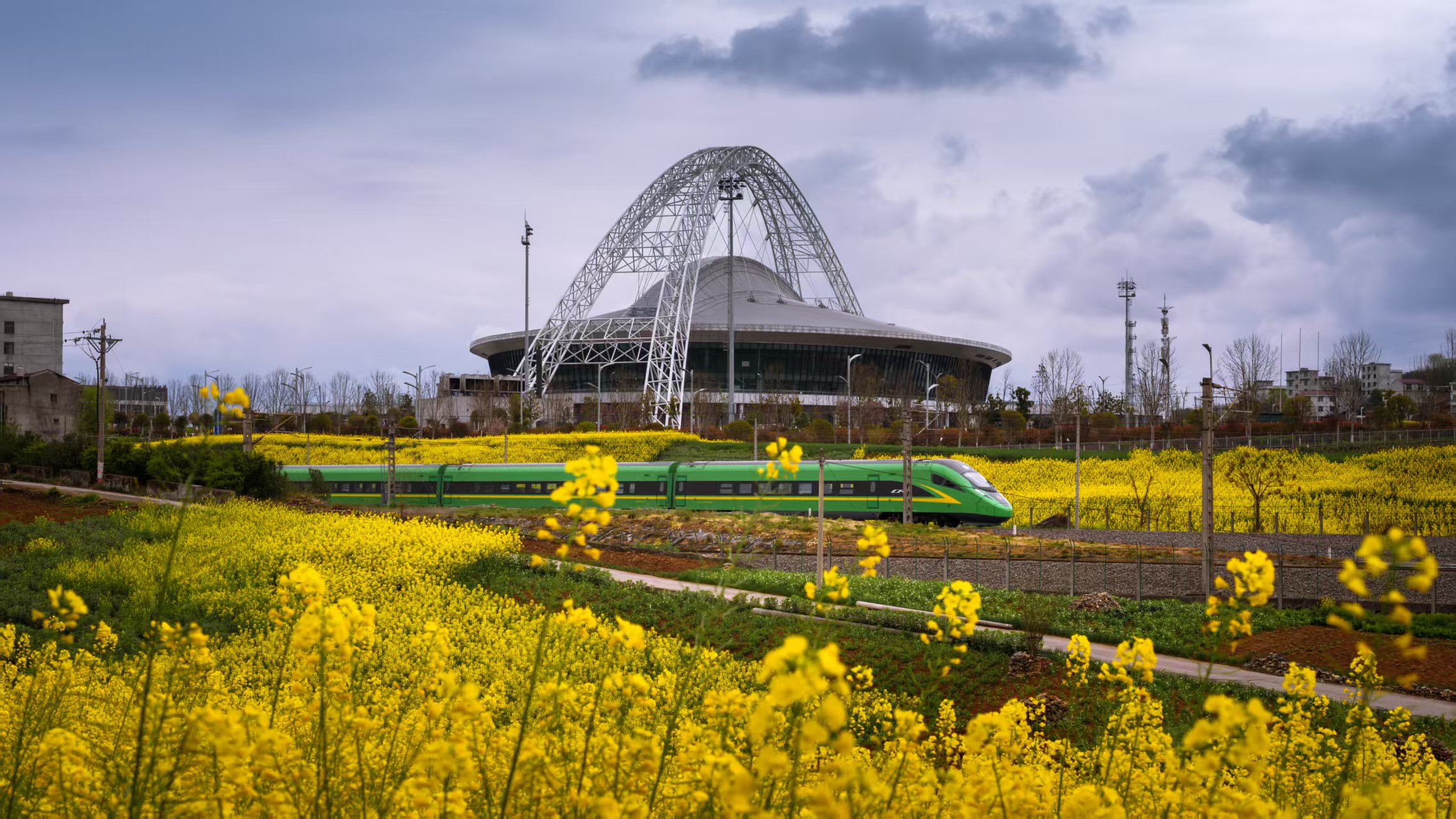 3月16日,安康市體育館前,金黃的油菜花海與飛馳的復(fù)興號列車相映成趣,盡顯春日生機(jī)。王坤侖 攝
