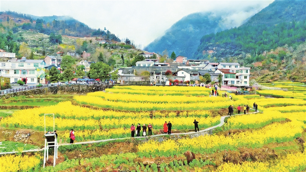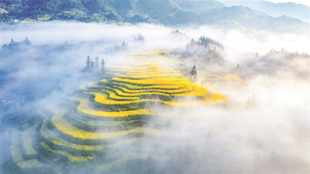 沿著蜿蜒的山路盤旋而上,轉(zhuǎn)過一個山坳,眼前豁然開朗——那金黃的油菜花,竟從山腳一直鋪到云端。層層疊疊的梯田,依著山勢盤旋而上,每一道田埂都勾勒出柔美的曲線。油菜花便順著這些曲線,開得浩浩蕩蕩,開得理直氣壯。晨霧未散時,花海在薄紗般的霧氣里若隱若現(xiàn),恍若仙境;待太陽升高,霧氣褪去,那金黃便愈發(fā)耀眼,直晃得人瞇起眼睛。風(fēng)過處,花浪翻涌,從這山傳到那山,沙沙的聲響里,滿是春天的氣息。