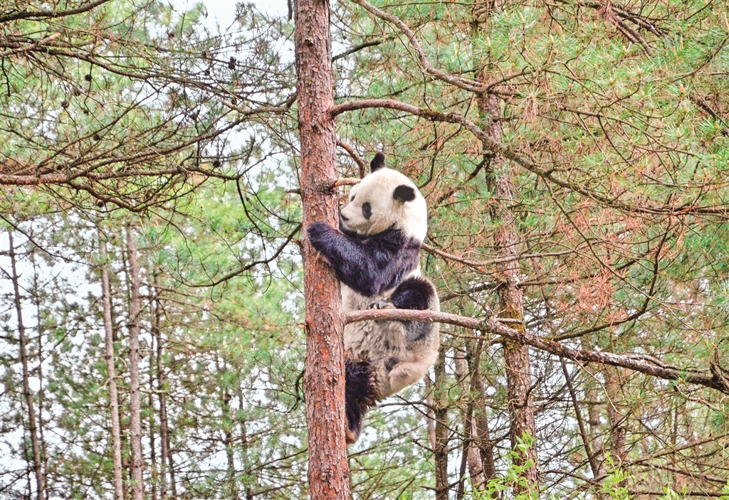 在樹上躲避天敵、等待母親歸來(lái)的大熊貓幼崽