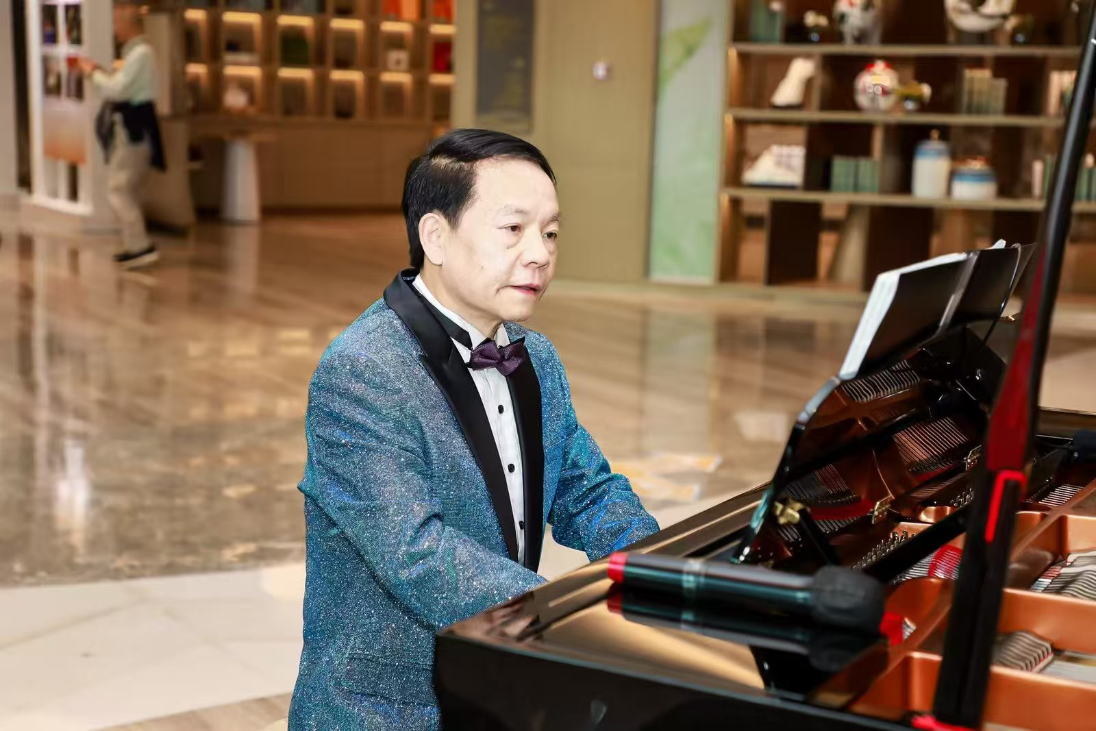 “第二點(diǎn),共鳴腔體。”他用手指輕點(diǎn)自己的胸腔、喉部、口腔、頭腔,“這四個(gè)位置,就是你的聲音工廠。聲音不是從嗓子里硬擠出來(lái)的,是共振出來(lái)的?!敝v到興頭上,他干脆現(xiàn)場(chǎng)示范了一段《草原之夜》的引子,高亢透亮的男高音在劇場(chǎng)中回蕩,每一個(gè)音符都清晰得如同落在耳畔。喝彩聲尚未平息,他又邀出他的學(xué)生、平利縣文化館館長(zhǎng)陳尚忠。師生二人即興合奏,琴聲與人聲交織,40余年的師生情誼在旋律中靜靜流淌。