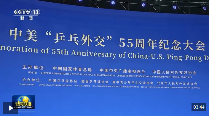4月10日,習(xí)近平主席向中美“乒乓外交”55周年紀(jì)念大會(huì)暨中美青少年體育交流系列活動(dòng)啟動(dòng)儀式致賀信,高度評(píng)價(jià)“乒乓外交”的歷史和現(xiàn)實(shí)意義,鼓勵(lì)兩國各界人士特別是青年一代相知相親、攜手前行,為兩國關(guān)系注入強(qiáng)大動(dòng)力和溫暖能量。習(xí)近平主席的賀信在中美各界人士中引發(fā)熱烈反響。