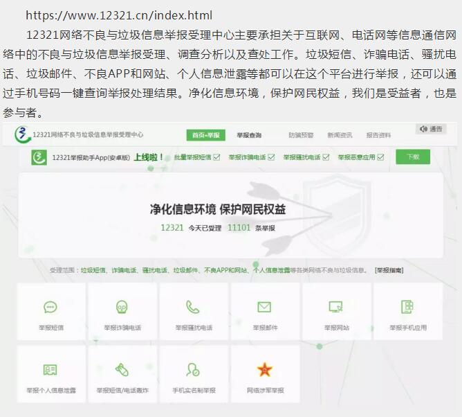 12321網(wǎng)絡(luò)不良與垃圾信息舉報(bào)受理中心主要承擔(dān)關(guān)于互聯(lián)網(wǎng)、電話網(wǎng)等信息通信網(wǎng)絡(luò)中的不良與垃圾信息舉報(bào)受理、調(diào)查分析以及查處工作。垃圾短信、詐騙電話、騷擾電話、垃圾郵件、不良APP和網(wǎng)站、個(gè)人信息泄露等都可以在這個(gè)平臺(tái)進(jìn)行舉報(bào),還可以通過手機(jī)號碼一鍵查詢舉報(bào)處理結(jié)果。凈化信息環(huán)境,保護(hù)網(wǎng)民權(quán)益,我們是受益者,也是參與者。