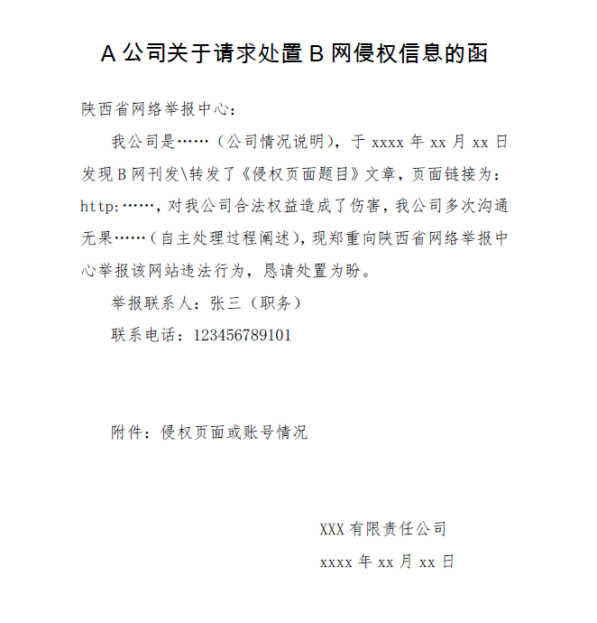 3.網(wǎng)絡侵權信息舉報請通過“侵權類”舉報入口提交,舉報人須實名舉報,同時必須提交請求維權處置函件和詳實的舉證材料。陜西省網(wǎng)絡舉報中心受理省內(nèi)各級政府組織、企事業(yè)單位和個人的互聯(lián)網(wǎng)侵權舉報,舉報行為執(zhí)行者須為政府、企事業(yè)單位等組織的責任部門或舉報主體本人,并清晰陳述侵權事實、侵權信息頁面鏈接、請求處置訴求等信息,舉證材料要盡可能詳實、完備。